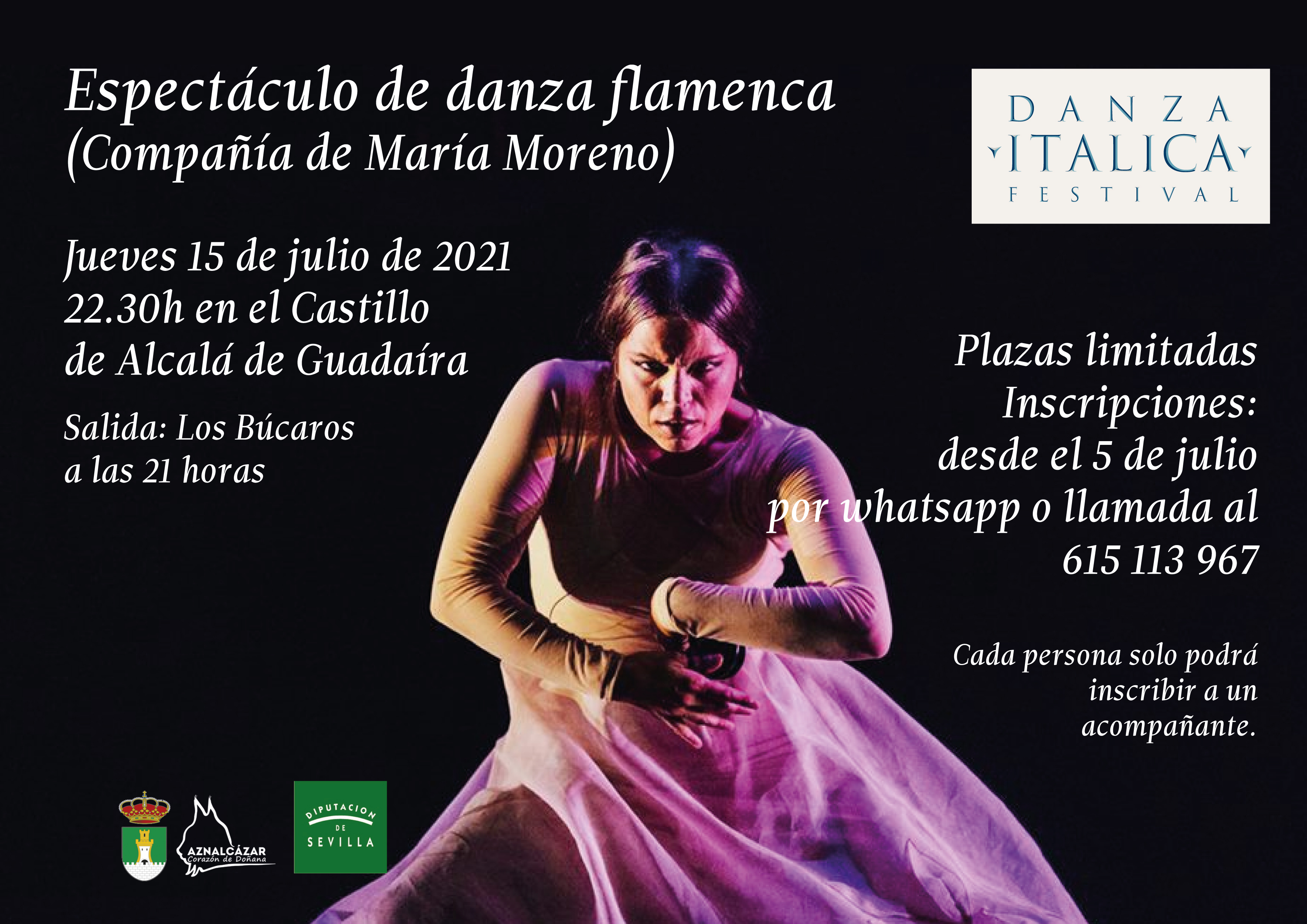Se trata del espectáculo de la bailaora María Moreno que dará comienzo a las 22.30h (la salida de Aznalcázar será a las 21:00h)
