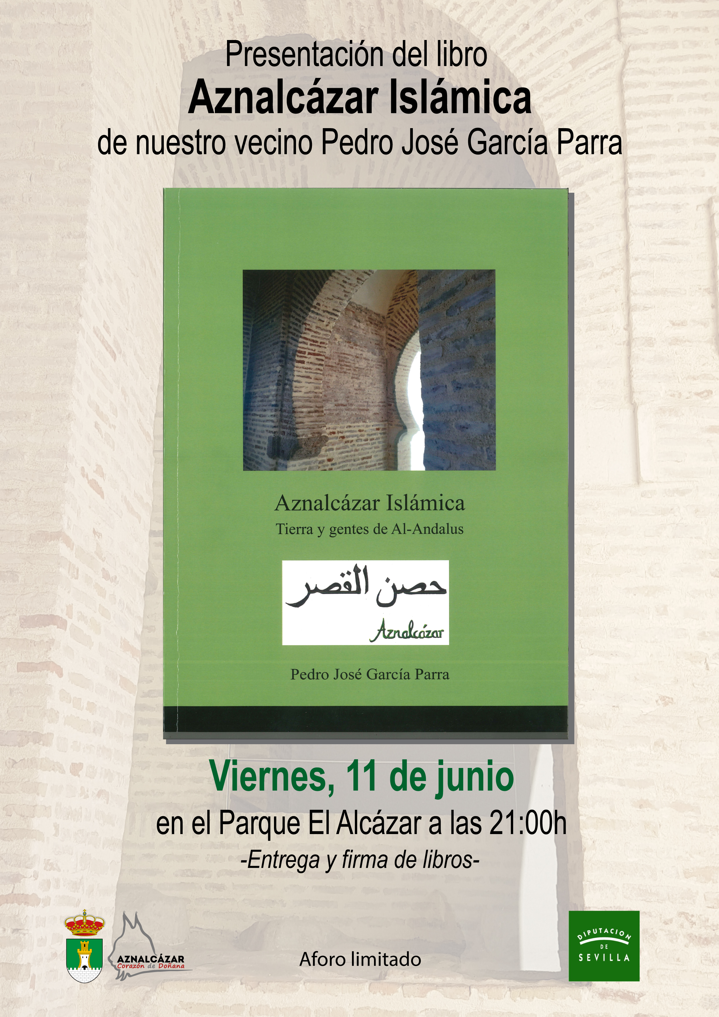 El viernes 11 de junio tendrá lugar la presentación del libro AZNALCÁZAR ISLÁMICA. TIERRA Y GENTES DE AL-ANDALUS de nuestro vecino Pedro José García Parra. Se llevará a cabo en el Parque El Alcázar a las 21.00h.