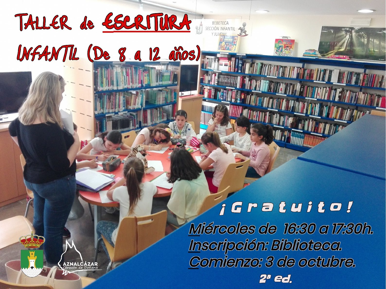 La Delegación de Cultura del Ayuntamiento de Aznalcázar oferta esta actividad, en la que los más pequeños aprenden habilidades básicas para una expresión escrita correcta, técnicas para la narración, se mejora la ortografía, entran en contacto con el mundo de los libros, crean cuentos, escriben poesías, editan un periódico, etc.