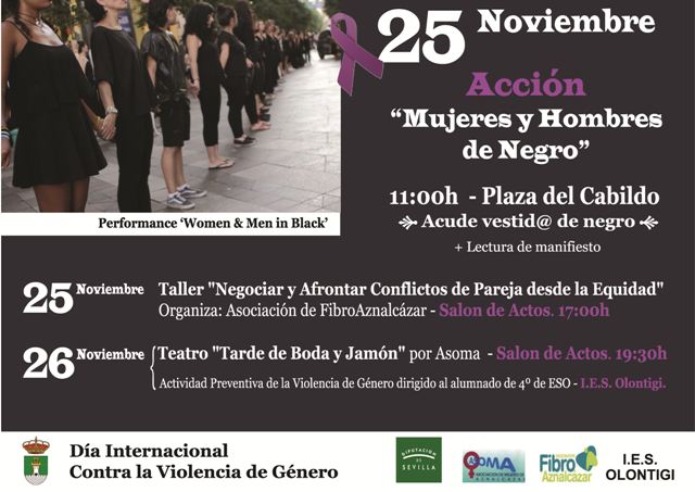 - 11:00h. En la Plaza del Ayuntamiento se realizará la lectura del manifiesto por la No Violencia y una performance llamada "Women & Men in Black" por lo que se pide que los asistentes acudan vestidos denegro.