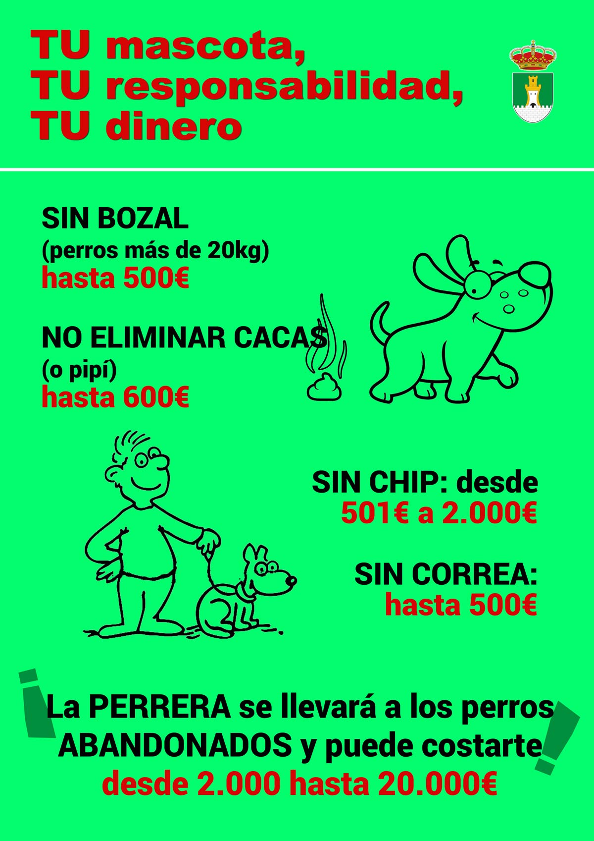 Por ello a través de un cartel se informa sobre las sanciones que conlleva tanto un mal cuidado de los animales de compañía, como el no recoger los excrementos o dejarlos sueltos, recordando que las mascotas son responsabilidad de sus dueños.
