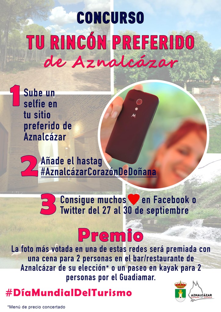 Se trata de un concurso denominado 'Tu rincón preferido de Aznalcázar, en el que los participantes deben realizarse un selfie en su lugar favorito del municipio y publicarlo en Facebook o Twitter con el hastag #AznalcázarCorazónDeDoñana. El objetivo es difundir estas imágenes para que obtengan muchos 'me encanta' y la que más obtenga entre el 27 y el 30 de septiembre será la ganadora. Su autor/a conseguirá un premio a elegir entre cena para dos personas en un bar/restaurante de su elección (precio de menú concertado) o un paseo en Kayak por el Guadiamar para dospersonas.