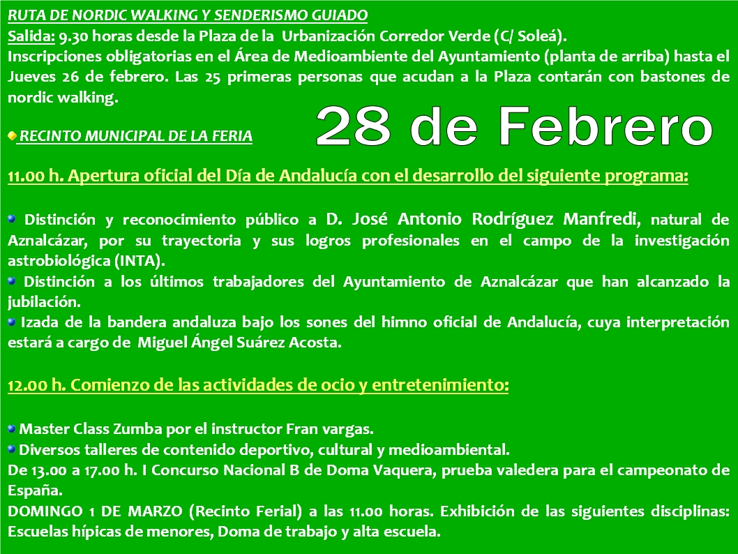 Con motivo de la celebración del Día de Andalucía a partir de las 9.30 h comenzará la Ruta “Nordic Walking” (NW) y de senderismo guiado. La salida se realizará desde la Plaza Urb. Corredor Verde (C/Soleá) y los interesados en participar deben inscribirse en el área de Medio Ambiente hasta el 26 de febrero a las 14.00h.