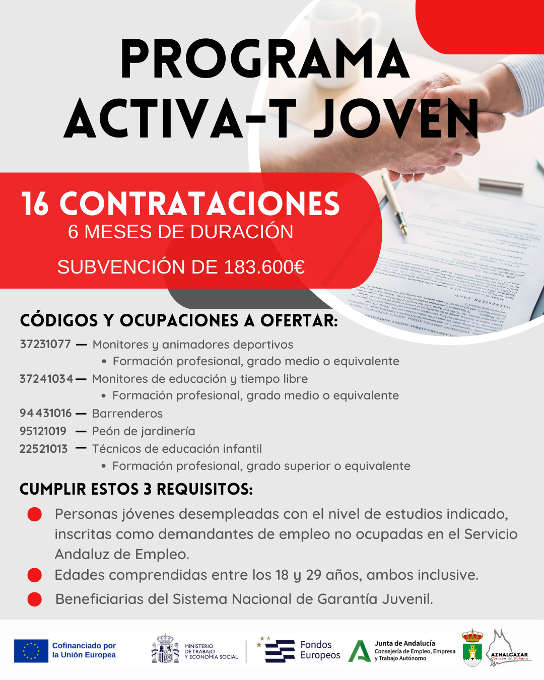 El Ayuntamiento de Aznalcázar ha recibido una subvención de la Consejería de Empleo, Empresa y Trabajo Autónomo de la Junta de Andalucía, financiada por la Unión Europea con cargo al Programa FSE+ Andalucía 2021-2027, enmarcada en el Programa Activa-T Joven para fomentar la inserción laboral en el ámbito local y mejorar la empleabilidad de las personas jóvenes desempleadas inscritas en el Sistema Nacional de Garantía Juvenil.