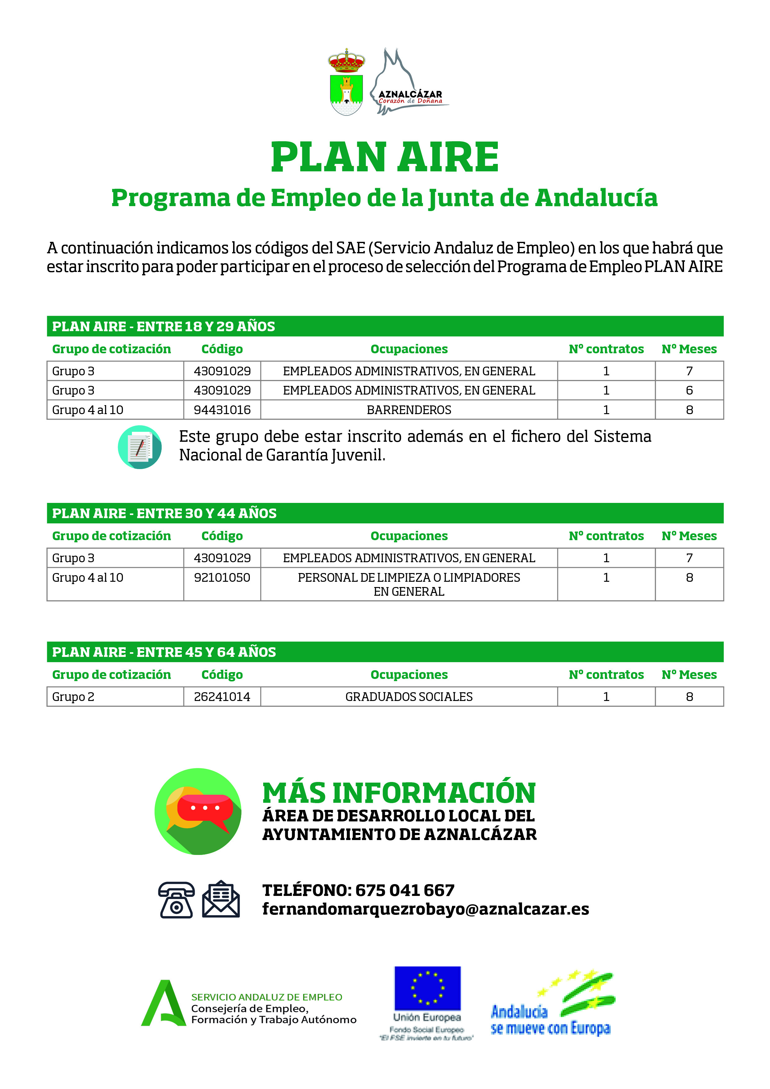 Informamos de la relación de puestos que se solicitarán para la nueva Iniciativa para la Activación, Impulso y Recuperación del Empleo (Iniciativa AIRE) de la Junta de Andalucía. Recordamos a los jóvenes que deben estar inscritos, además de en el SAE, en el Sistema de Garantía Juvenil.
