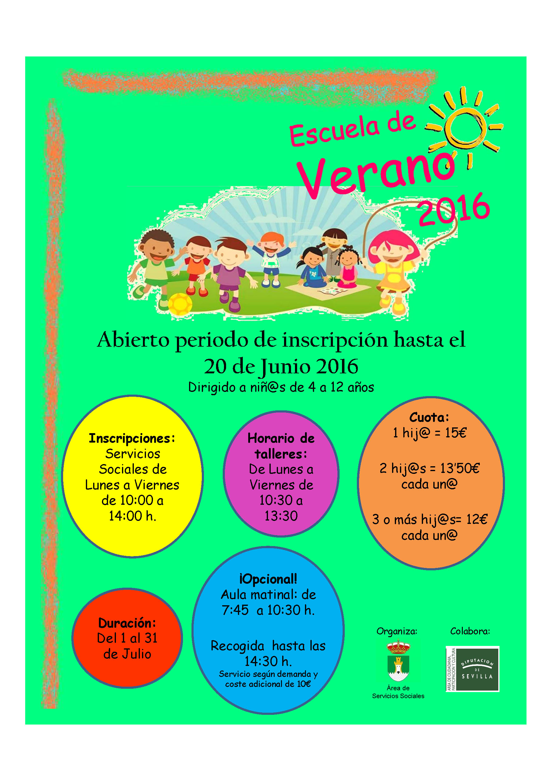 Ya se ha abierto el plazo de inscripción para la Escuela de Verano 2016, dirigida a niños y niñas desde 4 a 12 años. Las inscripciones se entregan en Servicios Sociales hasta el 20 de junio de lunes a viernes de 10:00h a 14:00h.