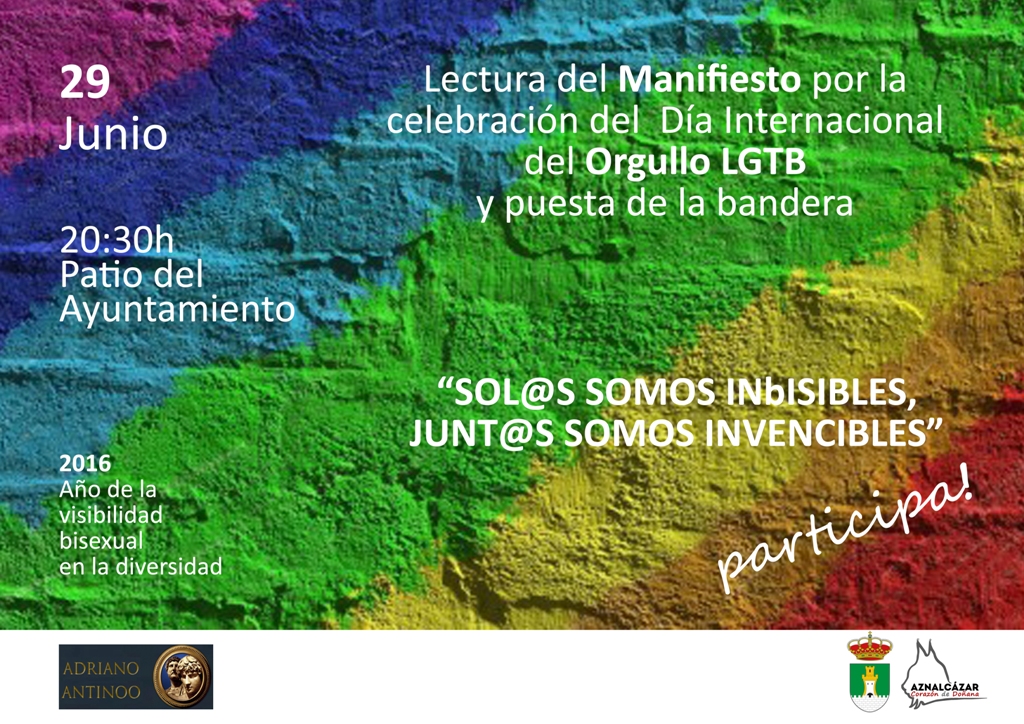 Este año la celebración del Día del Orgullo gira en torno al colectivo bisexual bajo el lema “SOL@S SOMOS INbiSIBLES, JUNT@S SOMOSINVENCIBLES”. Para la celebración de este acto se vuelve a contar con la colaboración de la Asociación Adriano Antinoo, organización LGTB de ámbito andaluz, con sede en Sevilla.