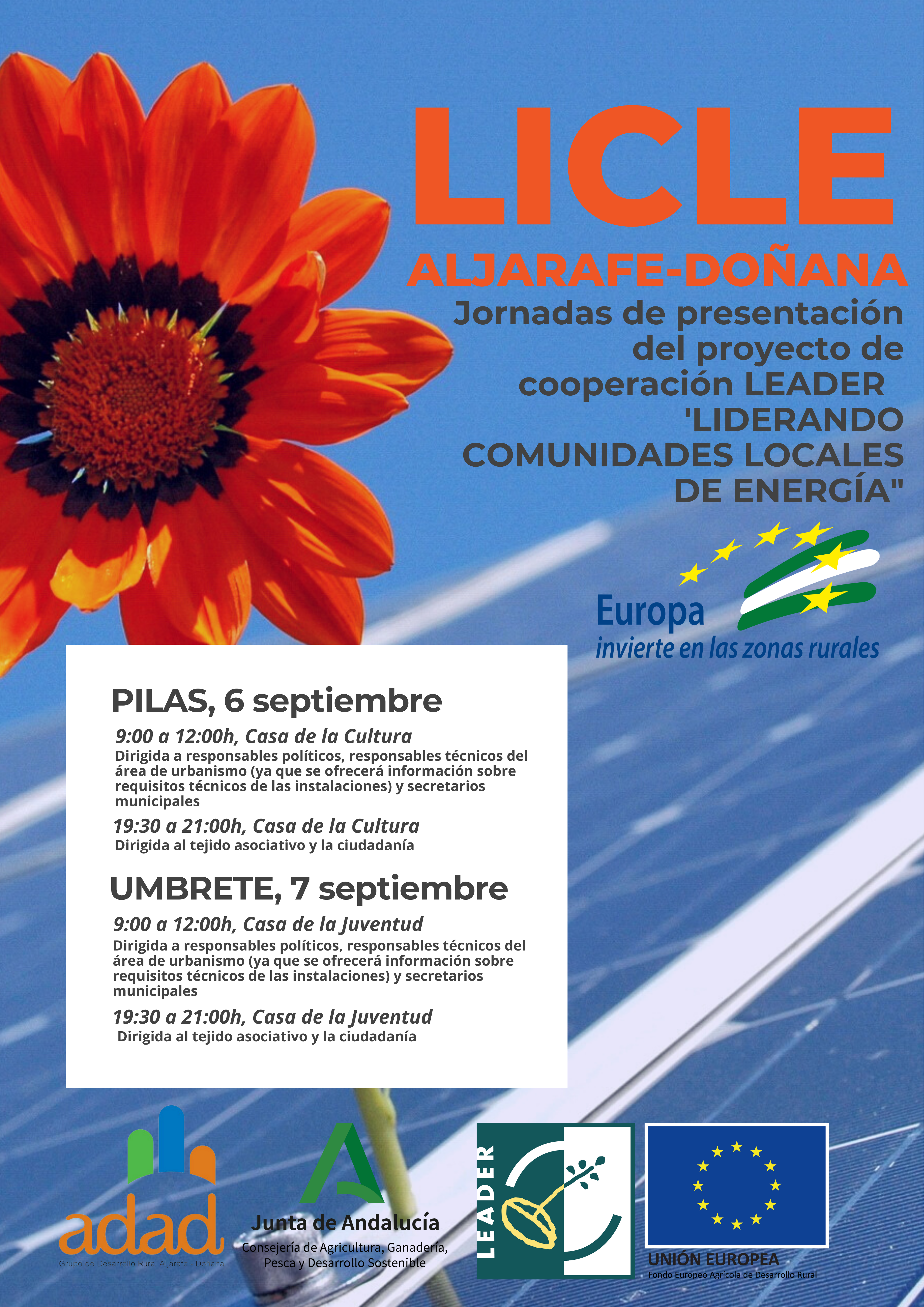 El Grupo de Desarrollo Rural Aljarafe-Doñana (ADAD) organiza los próximos 6 y 7 de septiembre en Pilas y Umbrete jornadas informativas sobre el proyecto de cooperación Leader LICLE, una iniciativa que financia la Consejería de Agricultura, Ganadería, Pesca y Desarrollo Sostenible y el FEADER de la Unión Europea y que tiene como objeto promover una de las claves del nuevo paradigma energético europeo, la producción y autoconsumo de energía eléctrica mediante fuentes renovables.
