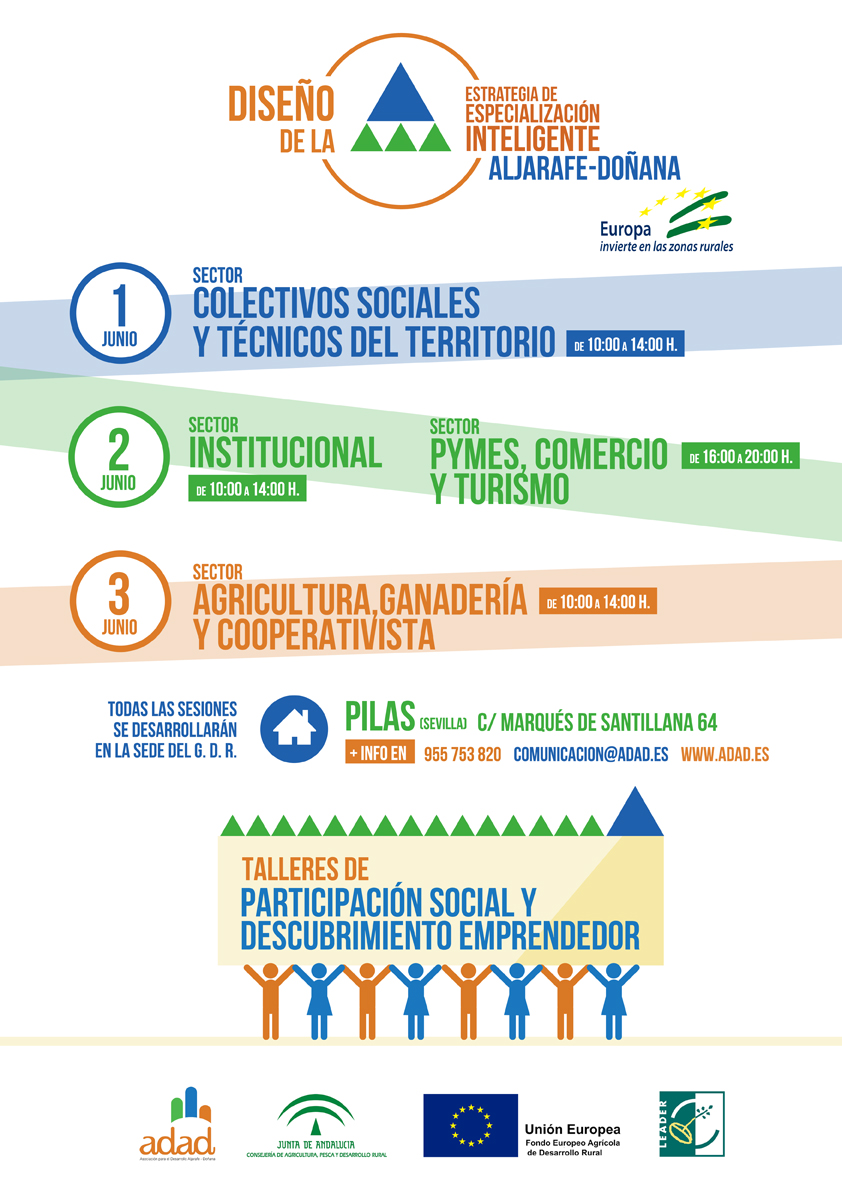 Del lunes 1 al miércoles 3 de junio, los agentes del territorio están llamados a participar en este nuevo proceso , a través de talleres que tendrán lugar en la sede de ADAD en Pilas y que están específicamente dirigidos a Colectivos Sociales y Técnicos (lunes 1 de 10:00 a 14:00 horas); Institucional (martes 2 de 10:00 a 14:00 horas); Pymes, Comercio y Turismo (martes 2 de 16:00 a 20:00 horas); y Agricultura, Ganadería y Cooperativas (miércoles 3 de 10:00 a 14:00 horas).