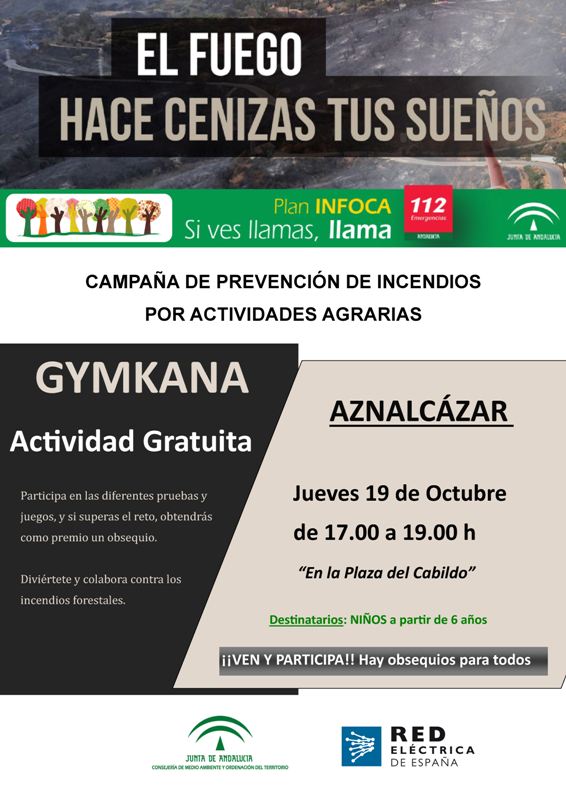Desde la Consejería de Medio Ambiente y Ordenación del Territorio de la Junta de Andalucía se está llevando a cabo una campaña de información para la prevención de incendios forestales. El próximo 19 de octubre se celebrará en Aznalcázar una Gymkana de 17:00 a 19:00h en la Plaza del Cabildo. El objetivo es concienciar a través de las diferentes pruebas y juegos. Además, para los que superen los retos tendrán un obsequio como premio. La actividad es gratuita sólo ven y participa en las pruebas.