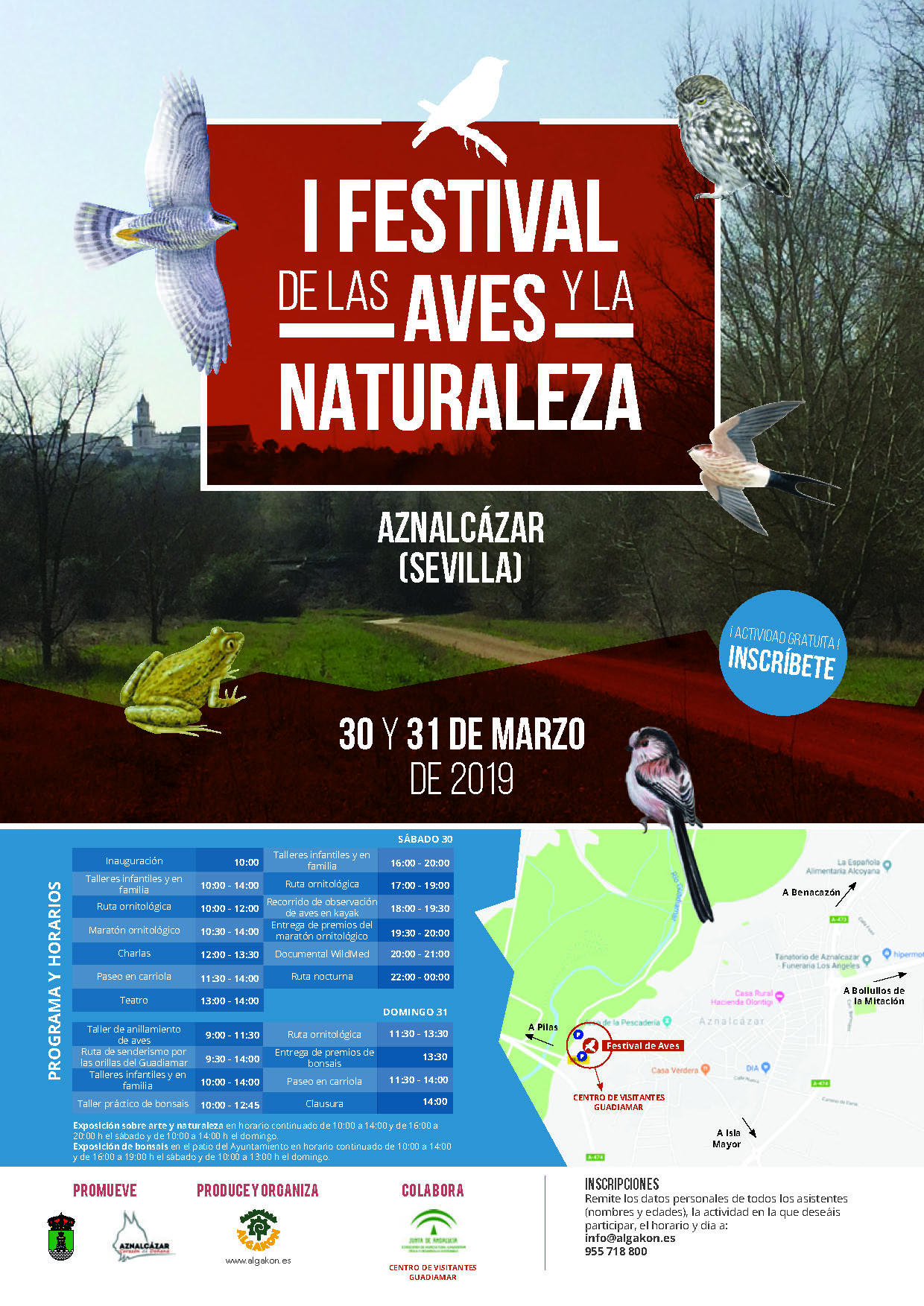 Los días 30 y 31 de marzo de 2019 Aznalcázar celebra el I Festival de las Aves y Naturaleza, en las inmediaciones del Corredor Verde del Guadiamar. Se ha diseñado un amplio programa de actividades tanto para adultos como para niños con el objetivo de que toda la familia pueda disfrutar del entorno natural y del mundo de las aves. Todas las actividades son gratuitas, previainscripción.