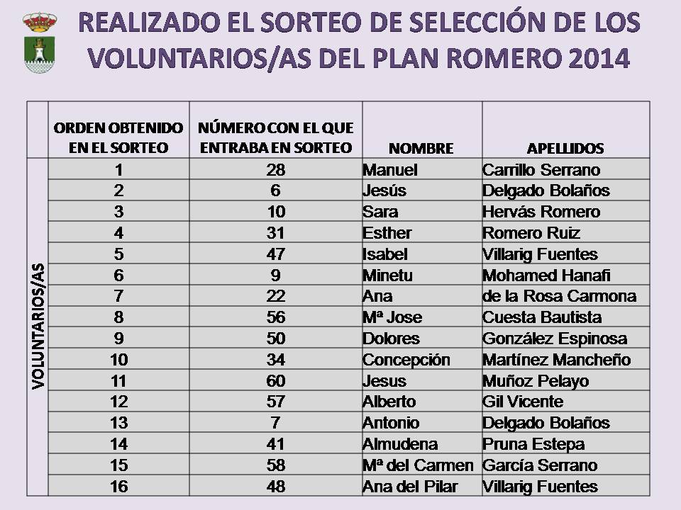 El pasado día 19 de mayo de 2014, a las 12.00h, en el Salón de Plenos de este Ayuntamiento, se realizó el sorteo público para la selección de los participantes en el Voluntariado ambiental del Plan Romero 2014.